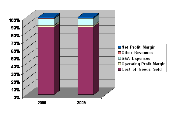 Compare each cost with sales, Cost of Good Sold was increased from 89.04% to 89.50%, Operating Profit Margin was increased from 1.97% to 2.42%, S & A Expenses was decreased from 9.08% to 8.62%, Other Revenues was increased from 0.10% to 0.54%, Net Profit Margin was increased from 1.37% to 1.68%.