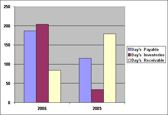 Day's Payable was increased from 116 days to 187 days, and Day’s Inventories was increased from 34 days to 204 days, while Day’s Receivables was decreased from 180 days to 84 days.