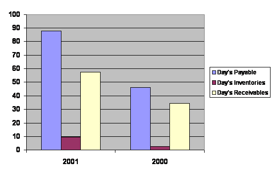 Day’s Payable was increased from 47 days to 88 days, Day’s Inventories was increased from 3 days to 10 days, and Day’s Receivables was increased from 35 days to 58 days.