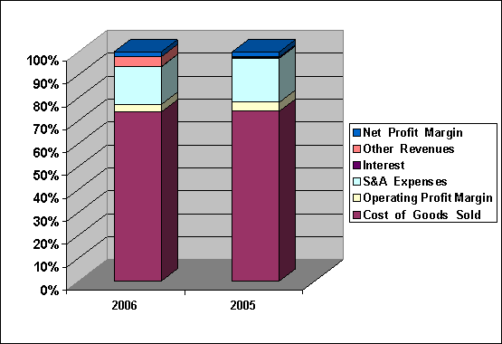 Compare each cost with sales, Cost of Good Sold was increased from 76.35% to 82.78%, Operating Profit Margin was decreased from 4.02% to 3.73%, S & A Expenses was decreased from 19.77% to 18.35%, Interest Paid was decreased from 0.48% to 0.17%, Other Revenues was increased from 0.14% to 4.86%, Net Profit Margin was increased from 2.28% to 2.41%.
