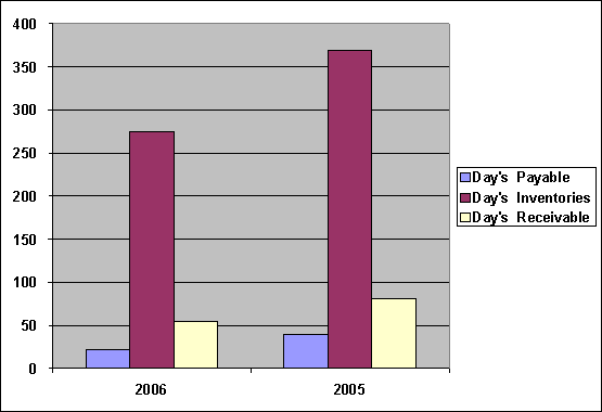 Day's Payable was decreased from 40 days to 23 days, Day’s Inventories was decreased from 370 days to 276 days, and Day’s Receivables was decreased from 81 days to 55 days.