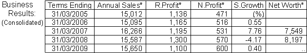 For the current term ending Mar 2009 the recurring profit is projected at Yen 1,100 million and the net profit at Yen 600 million, on a 0.4% rise in turnover, to Yen 15,650 million. Planning to expand facilities of No.2 plant in Thailand, depending on stronger demand.
