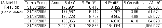 (Apr/Sept/2007 results): Sales Yen 94,500 million (down 0.4%), operating profit Yen 3,721 million (down 23.6%), recurring profit Yen 3,435 million (down 28.0%), net profit Yen 953 million (down 55.8%). (% compared with the same period a year ago)