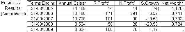 For the current term ending Mar 2009 the recurring profit is projected at Yen 100 million and the net profit at Yen 70 million, on a 1.2% rise in turnover, to Yen 8,634 million. Brand items will continue steady growth, while the firm is narrowing items to highly-profitable ones to improve profits.